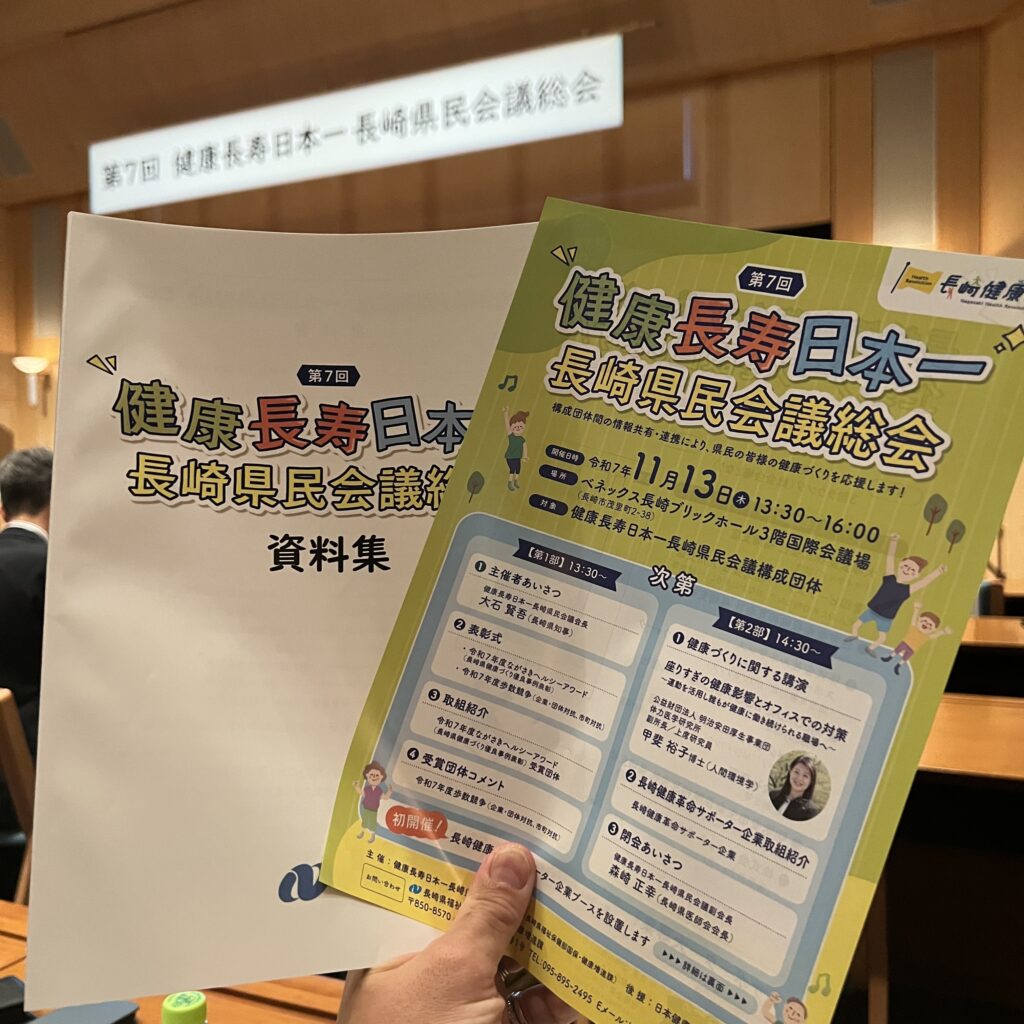 2025年11月、長崎県が主催する「第7回 健康長寿日本一長崎県民会議総会」 が開催され、平山組も長崎健康革命サポーターとして参加いたしました。本会議は、健康寿命延伸に向けた最新の研究、自治体の取り組み、企業・団体の健康支援活動を共有し、県全体でWell-beingを高めることを目的としたものです。